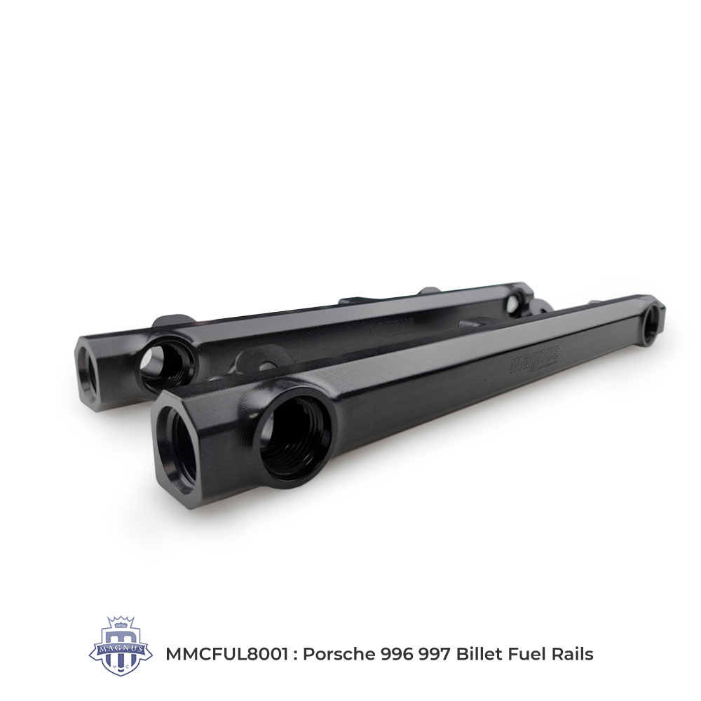 If you are upgrading the fuel system in your 996 – 996 Porsche turbo these parts are what you are looking for. All billet construction, 3D CAD designed and 5 axis machined from T-6061 Aluminum in house at Magnus. Our Porsche Fuel rails are the solution to upgrading your stock Porsche fuel delivery system for your high horsepower build. We designed our fuel rails to work with a variety of fuels, such as methanol, ethanol, and gasoline. 4 -8 ORB ports are on the rails for you to better plumb your fuel system, you will need 2 plugs and 2 fittings per rails which are not included. These are now updated to provide more clearance to the cam actuator solenoid.
